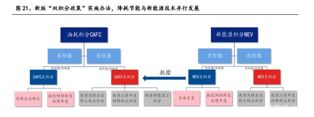 接力補貼政策,雙積分政策出臺。為了確保補貼政策退出之后,新能源汽車扶持力度不會斷檔,同時加快傳統(tǒng)燃油車的技術(shù)升級,2017 年 9 月工信部等五個部門 聯(lián)合發(fā)布了《乘用車企業(yè)平均燃料消耗量與新能源汽車積分并行管理辦法》,即“雙 積分政策”,對乘用車企業(yè)設(shè)立油耗積分(CAFC)和新能源積分(NEV)兩個考核 指標(biāo),鼓勵車企發(fā)展新能源技術(shù)的同時兼顧傳統(tǒng)燃油車的節(jié)能減排。CAFC=(達標(biāo) 值-實際值)×年度生產(chǎn)/進口總量,NEV =達標(biāo)值-實際值,當(dāng)實際值低于達標(biāo)值 時產(chǎn)生正積分,高于達標(biāo)值時產(chǎn)生負積分。其中,CAFC 正積分只能自行結(jié)轉(zhuǎn)或轉(zhuǎn) 讓給關(guān)聯(lián)企業(yè),不能用于 NEV 負積分的抵償,而 NEV 正積分則可以自由交易,可 抵償 NEV 負積分和 CAFC 負積分。最終核算時不同車型的積分相加結(jié)果必須為正, 若產(chǎn)生 CAFC 負積分,則需向其他正積分企業(yè)購買 CAFC 正積分或 NEV 正積分,若 產(chǎn)生 NEV 負積分,則只能向其他正積分企業(yè)購買 NEV 正積分。