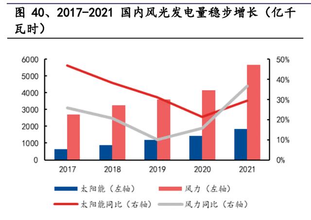 風(fēng)光發(fā)電量持續(xù)提升,多項政策加強新型儲能推廣應(yīng)用。受益于政策推動和硬成 本的下降,國內(nèi)可再生能源的發(fā)電量和滲透率逐步提升,2021 年光伏發(fā)電量和風(fēng) 力發(fā)電量分別為 1836.6 億千瓦時和 5667 億千瓦時,同比增長 29.2%和 36.7%,合 計占比從 2017 年的 5.33%提升至 2021 年 9.29%。由于風(fēng)光發(fā)電存在固有的間歇性 和波動性,其規(guī);l(fā)展勢必要求儲能行業(yè)對應(yīng)發(fā)展以平抑供需矛盾。2021 年 5 月,國家能源局發(fā)布《關(guān)于 2021 年風(fēng)電、光伏發(fā)電開發(fā)建設(shè)有關(guān)事項的通知》, 指出配套儲能設(shè)施為風(fēng)電、光伏發(fā)電項目市場化并網(wǎng)條件之一;同月,國家發(fā)改 委印發(fā)《關(guān)于“十四五”時期深化價格機制改革行動方案的通知》,指出要深入推 進能源價格改革,完善風(fēng)電、光伏發(fā)電、抽水蓄能價格形成機制,建立新型儲能 價格機制。