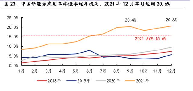 中國新能源汽車市場規(guī)模不斷擴大,滲透率穩(wěn)步上升,2022 年新能源汽車滲透率 將達 22%。得益于中國新能源補貼政策,中國新能源汽車滲透率不斷提高, 2018/2019/2020/2021 滲透率分別為 4.4%/5.0%/6.0%/15.6%,2021 年 12 月單月 滲透率達 20.6%,乘聯(lián)會預(yù)測 2022 年滲透率將達到 22%。2021 年全年新能源車銷 量達到 350 萬輛,同比增加 165%,其中乘用車 332 萬輛,同比增加 176%,12 月 單月新能源車銷量 53.1 萬輛,同比增加 114%,其中乘用車 49.8 萬輛,同比增加 121%。除政策之外,中國新能源汽車銷量和滲透率的不斷提高還得益于基礎(chǔ)設(shè)施 建設(shè)加快,新產(chǎn)品不斷優(yōu)化迭代等多方面因素。