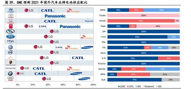 公司與國內(nèi)一線車企合資建廠,深度綁定造車新勢力,同時切入海外主機廠的供 應(yīng)鏈,形成優(yōu)質(zhì)多元的客戶結(jié)構(gòu)。2016 年起,寧德時代陸續(xù)與北京汽車、長安汽 車、長城汽車等國內(nèi)整車廠簽訂戰(zhàn)略合作協(xié)議,保持長期深入的合作伙伴關(guān)系。 2017 年起,先后與上汽集團、東風(fēng)汽車、廣汽集團、吉利汽車和一汽集團共同出 資設(shè)立合資公司共 7 家,直接供應(yīng)對應(yīng)整車廠,增加與穩(wěn)定公司的市場份額與地 位。2018 年,以“蔚小理”為代表的國內(nèi)造車新勢力開始交付,公司作為配套車 型最多的主流動力電池廠商,順利成為這三家整車廠的主力供應(yīng)商。其中,2021 年蔚來汽車和理想汽車由寧德時代獨供,對小鵬汽車的供應(yīng)占比超 80%,隨著產(chǎn) 銷量的大幅提升,2022 年預(yù)計公司對蔚來,小鵬,理想均可實現(xiàn)翻倍供應(yīng)。海外 客戶方面,2012 年,公司成為華晨寶馬首款 EV“之諾 1E”的動力電池供應(yīng)商, 打響了進軍國際市場的第一槍,2018 年獲得寶馬集團、戴姆勒、現(xiàn)代起亞等多家 海外主機廠的定點信,境外業(yè)務(wù)取得實質(zhì)性進展,2020 年公司與特斯拉簽署動力 電池框架協(xié)議,2021 年特斯拉超越蔚來成為公司第一大客戶,而公司也正式取代 LGES,成為特斯拉第一大動力電池供應(yīng)商。隨著配套車型的陸續(xù)上市與放量,公 司的全球化布局將更進一步。