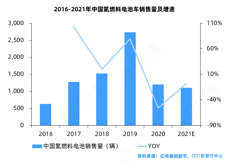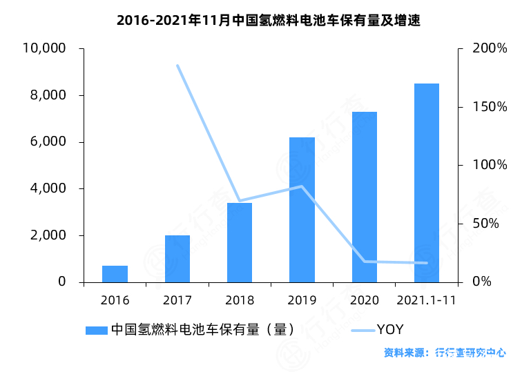 我國氫燃料電池車產業(yè)已基本涵蓋氫燃料電池整車、氫燃料電池系統(tǒng)、氫燃料電池電堆及零部件領域,基本建成以整車制造及氫燃料電池系統(tǒng)為主的氫燃料電池車供應鏈和產業(yè)鏈體系,尤其是在系統(tǒng)、電堆等方面已基本實現了國產化供應。2016-2020年我國氫燃料電池車保有量逐年攀升,近兩年受到疫情影響保有量增速有所下滑,根據中汽協(xié)及新能源汽車國家監(jiān)測與管理平臺公布的統(tǒng)計數據顯示,截至2021年11月我國氫燃料電池汽車保有量為8,452輛。2016-2019年中國氫燃料電池汽車銷量逐年上升,2020年以及2021年銷量下滑的主要原因是疫情以及補貼政策轉向及示范城市群的開展導致銷量下降,預計產品銷量會延遲到2022年放量。截至2021年11月底,2021年我國氫燃料電池車銷售量超1,000輛,市場進入商業(yè)化初期。