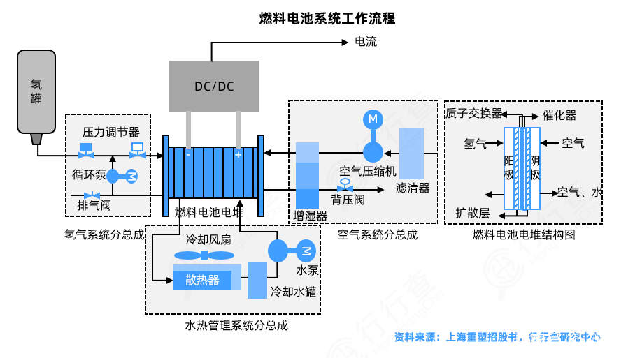 燃料電池系統(tǒng)使用供氫系統(tǒng)提供的氫氣進行電化學反應,經過DC/DC轉換輸出,以輸出滿足下游應用場景中不同電機工作電壓要求的電流。燃料電池的電化學反應,消耗氫氣與氧氣,將氫氣中蘊含的化學能轉化為電能,反應過程不涉及燃燒,反應產物為電、熱和水。燃料電池系統(tǒng)主要由燃料電池電堆、空氣/氫氣供給系統(tǒng)、水熱管理系統(tǒng)、DC/DC這五大系統(tǒng)構成。燃料電池電堆可以通過電化學反應輸出電流;空氣/氫氣供給系統(tǒng)是為電堆供應合適壓力、純度、濕度的氫氣與空氣;水熱管理系統(tǒng)用于傳遞電化學反應產生的熱量,保持燃料電池內部水平衡和熱平衡;DC/DC變換器用于實現燃料電池與整車高壓之間解耦。