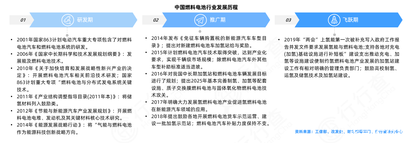 我國氫燃料電池起步較晚,2001年國家863計劃“電動汽車”重大科技專項即已確立了以混合動力汽車、純電動汽車、燃料電池汽車為“三縱”,以多能源動力總成控制系統(tǒng)、驅動電機和動力電池為“三橫”的電動汽車“三縱三橫”研發(fā)布局,并持續(xù)全面組織啟動大規(guī)模電動汽車技術研發(fā),其中包含了對燃料電池汽車和燃料電池系統(tǒng)的研發(fā)。隨后國家相關部門出臺了一系列政策及研發(fā)計劃,促進氫燃料電池的研發(fā)進步,其內容涵蓋了制氫、儲氫、燃料電池部件以及電堆與系統(tǒng),氫燃料電池車等一系列課題,促進了整個產業(yè)鏈的發(fā)展與進步。