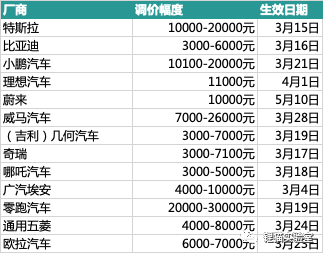 3月以來,特斯拉、比亞迪、小鵬汽車、理想汽車等多家車企調(diào)高售價。