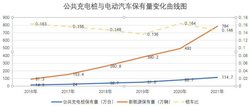 筆者整理公共充電樁及新能源汽車(chē)保有量發(fā)現(xiàn),除2020年樁車(chē)比有短暫提升外(主要由于疫情影響,新能源市場(chǎng)受阻,同時(shí)充電樁被列為新基建后爆發(fā)增長(zhǎng)),近6年來(lái),樁車(chē)比數(shù)值都處于下滑趨勢(shì),每輛新能源汽車(chē)平均只能分配到0.1個(gè)公共充電樁。