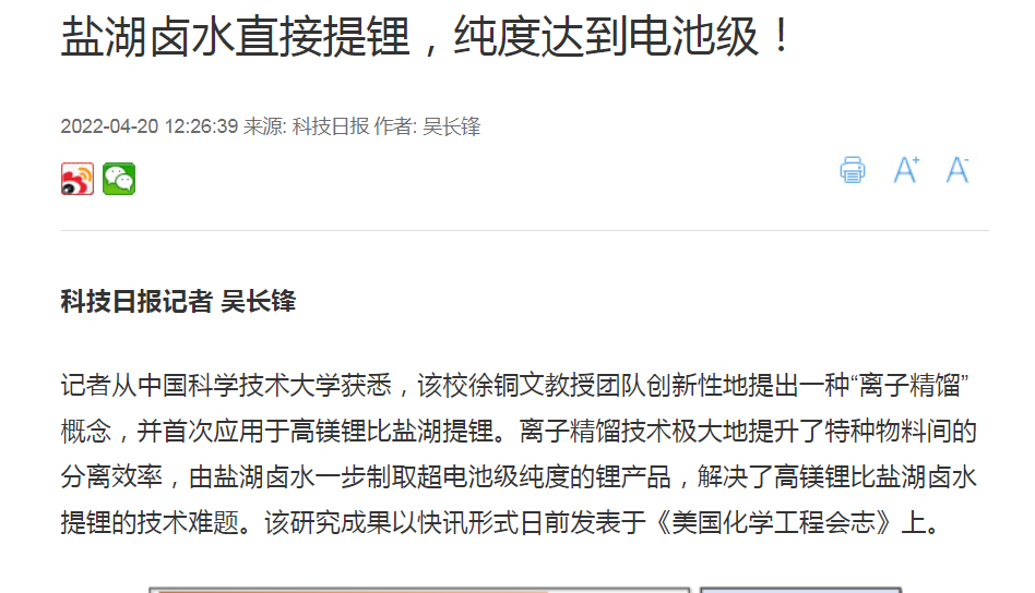 值得注意的是,鹽湖提鋰技術(shù)正不斷提高。根據(jù)科技日報(bào)4月20日報(bào)道,近日,中國科學(xué)技術(shù)大學(xué)創(chuàng)新性地提出一種“離子精餾”概念,并首次應(yīng)用于高鎂鋰比鹽湖提鋰。離子精餾技術(shù)極大地提升了特種物料間的分離效率,由鹽湖鹵水一步制取超電池級(jí)純度的鋰產(chǎn)品,解決了高鎂鋰比鹽湖鹵水提鋰的技術(shù)難題。