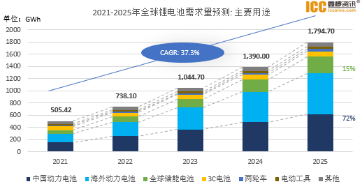 根據(jù)鑫欏數(shù)據(jù)庫(kù)統(tǒng)計(jì),2021年鋰電池的需求量為505.42GWh,預(yù)計(jì)到2025年,全球鋰電池的需求量將達(dá)到1794.7GWh。到2025年,新能源車(chē)和儲(chǔ)能仍將是鋰電池的主要的應(yīng)用領(lǐng)域,這兩個(gè)領(lǐng)域的鋰電池出貨量合計(jì)占比預(yù)計(jì)高達(dá)87%,其中,動(dòng)力電池的市場(chǎng)占比將達(dá)到72%,儲(chǔ)能的占比將達(dá)到15%。