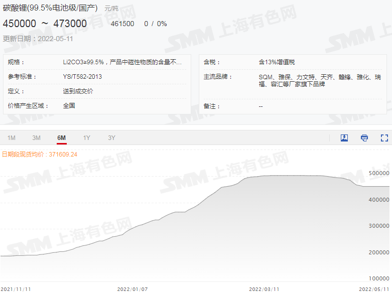 據(jù)SMM現(xiàn)貨價(jià)格顯示,進(jìn)入2022年,電池級(jí)碳酸鋰現(xiàn)貨均價(jià)從年初的27.8萬(wàn)元/噸漲至3月31日的50.25萬(wàn)元/噸,漲幅達(dá)80.76%。進(jìn)入4月份,碳酸鋰價(jià)格略有回調(diào),近期暫穩(wěn)于46.15萬(wàn)元/噸,依舊處于多年高位。