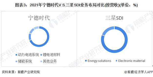 寧德時(shí)代主營(yíng)業(yè)務(wù)圍繞鋰電池布局,是全球領(lǐng)先的動(dòng)力電池企業(yè)。包括動(dòng)力電池系統(tǒng)、儲(chǔ)能系統(tǒng)、鋰電池材料和其他業(yè)務(wù)。2021年動(dòng)力電池系統(tǒng)營(yíng)收占比最高,為69%;三星SDI的業(yè)務(wù)布局除了新能源之外,還包括電子材料,2021年新能源業(yè)務(wù)占比較高,為81%。