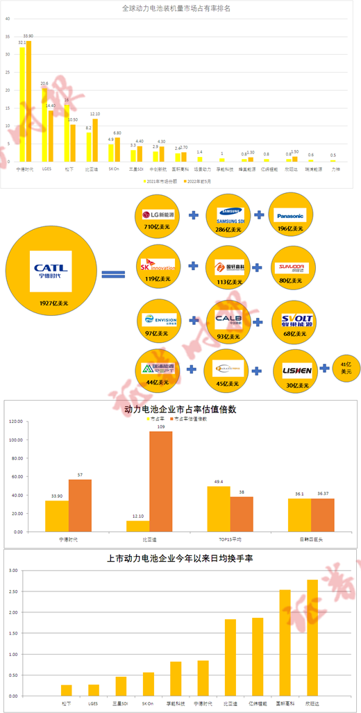 以寧德時代最新市值看,相當(dāng)于除比亞迪外2021年動力電池出貨量前15強的12家公司總和,還能剩下41億美元。