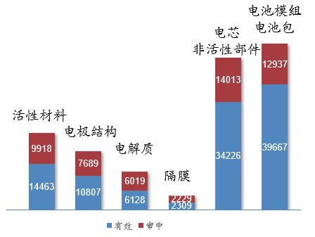 圖1:鋰離子電池各技術(shù)方案審中及有效的中國(guó)專(zhuān)利數(shù)量分布