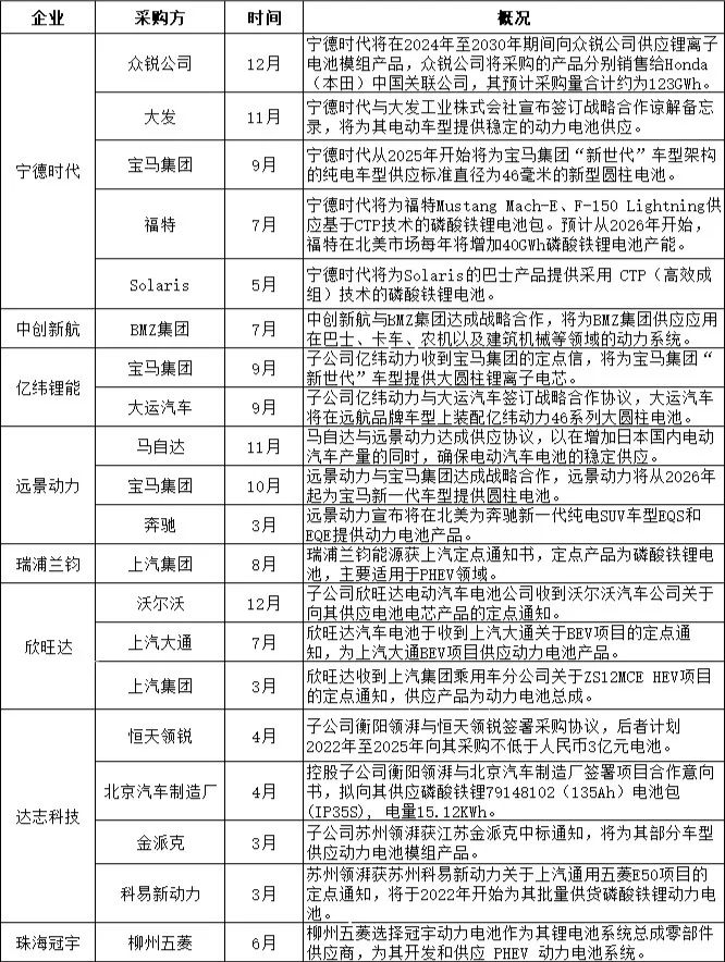 目前,大部分電池廠商對(duì)車(chē)企的供應(yīng)制度為長(zhǎng)期訂單模式,即與車(chē)企簽訂長(zhǎng)期協(xié)議,長(zhǎng)期供應(yīng)。如去年9月,寧德時(shí)代與寶馬集團(tuán)簽訂的一項(xiàng)長(zhǎng)期協(xié)議中規(guī)定,從2025年開(kāi)始,寧德時(shí)代將為寶馬集團(tuán)“新世代”車(chē)型架構(gòu)的純電車(chē)型供應(yīng)圓柱電池;12月,寧德時(shí)代與本田達(dá)成協(xié)議,約定2024年到2030年,寧德時(shí)代為本田在中國(guó)的生產(chǎn)供應(yīng)123GWh的純