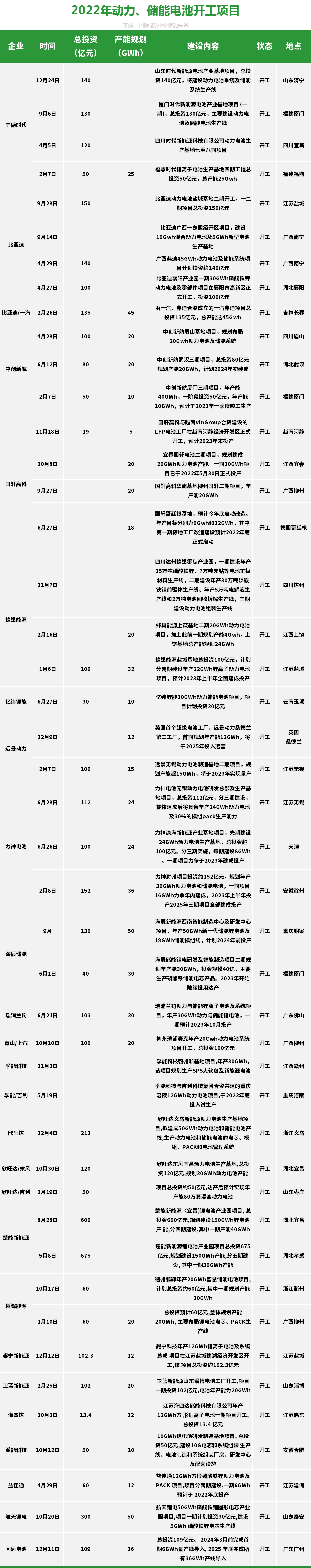 自2022年年初以來(lái),各大電池廠商的動(dòng)力電池、儲(chǔ)能電池產(chǎn)業(yè)基地項(xiàng)目紛紛開(kāi)工,產(chǎn)能規(guī)劃總量數(shù)額巨大。值得注意的是,這一系列舉動(dòng)與政策的引導(dǎo)不無(wú)關(guān)系。2022年1月,國(guó)家發(fā)展改革委、國(guó)家能源局印發(fā)了《“十四五”新型儲(chǔ)能發(fā)展實(shí)施方案》,方案提出,到2025年,新型儲(chǔ)能商業(yè)化初期步入規(guī)模化發(fā)展階段、具備大規(guī)模商業(yè)化應(yīng)用條件。其中,電化學(xué)儲(chǔ)能技術(shù)性能進(jìn)一步提升,系統(tǒng)成本降低30%以上。進(jìn)一步釋放出了針對(duì)電池企業(yè)的積極信號(hào),為動(dòng)力電池廠商的擴(kuò)產(chǎn)提供了不小的底氣。