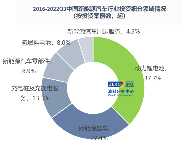 2016-2022Q3,我國(guó)新能源汽車行業(yè)投資主要集中于動(dòng)力鋰電池、新能源整車廠、氫燃料電池、充換電服務(wù)等細(xì)分領(lǐng)域,其中動(dòng)力鋰電池領(lǐng)域投資活躍度最高,投資案例數(shù)占比近40%,新能源整車廠投資規(guī)模最高,占比達(dá)52.8%。