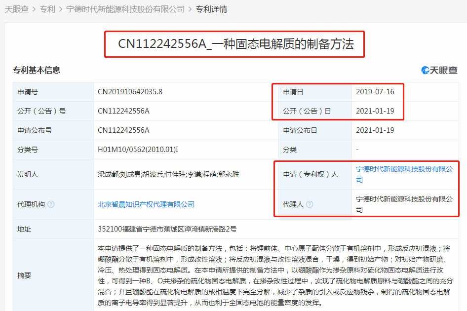 以寧德時(shí)代為例,雖然其主要陣地仍在液態(tài)電池,在半固態(tài)電池上的聲量也相對(duì)較大,但其在固態(tài)電池上仍保持著較強(qiáng)的競(jìng)爭(zhēng)力。2021年5月,寧德時(shí)代就曾表示,已經(jīng)可以完成固態(tài)電池的樣品;今年1月,天眼查顯示寧德時(shí)代新增了兩項(xiàng)有關(guān)固態(tài)電池的專(zhuān)利,分別為“一種固態(tài)電解質(zhì)的制備方法”和“一種硫化物固態(tài)電解質(zhì)片及其制備方法”,表明了其在固態(tài)電池領(lǐng)域的絕對(duì)地位。
