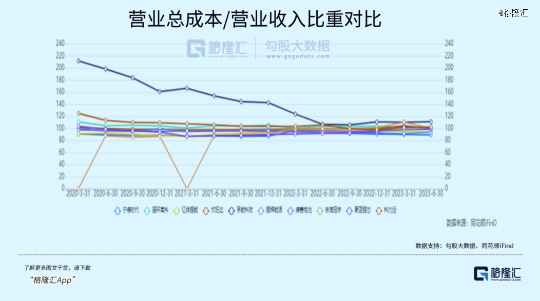 上半年出貨量靠前的企業(yè)如寧德時(shí)代、億緯鋰能、國(guó)軒高科規(guī)模效應(yīng)明顯,只有他們的營(yíng)業(yè)總成本所占營(yíng)收比重是隨著出貨量規(guī)模的提升而下滑,其中材料成本的增速隨著原材料價(jià)格下降相比一季度要收窄了一些。