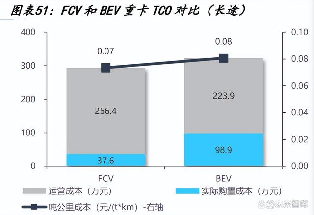 基于扶持期產(chǎn)業(yè)鏈成本情況和政策方案,在短島和長(zhǎng)途場(chǎng)景下,F(xiàn)CV 全周期經(jīng)濟(jì)性 均優(yōu)于換電重卡,在高補(bǔ)貼、氫氣資源優(yōu)勢(shì)地區(qū)具備性?xún)r(jià)比優(yōu)勢(shì)。以 49t 重卡為例, 假設(shè)全生命周期運(yùn)營(yíng)里程 100 萬(wàn)公里,測(cè)算得到短島場(chǎng)景下燃料電池重卡 TCO 約 318.93 萬(wàn)元,電動(dòng)重卡約337.82 萬(wàn)元,長(zhǎng)途高速場(chǎng)景下燃料電池重卡TCO約 294.01 萬(wàn)元,電動(dòng)重卡約 322.79 萬(wàn)元。燃料電池重卡經(jīng)濟(jì)性均優(yōu)于電動(dòng)重卡,即在當(dāng)前成 本水平及政策條件下,燃料電池重卡已實(shí)現(xiàn) TCO 低于電動(dòng)重卡,考慮部分地區(qū)氫氣 資源豐富,相應(yīng)燃料電池重卡的經(jīng)濟(jì)性將更加明顯。