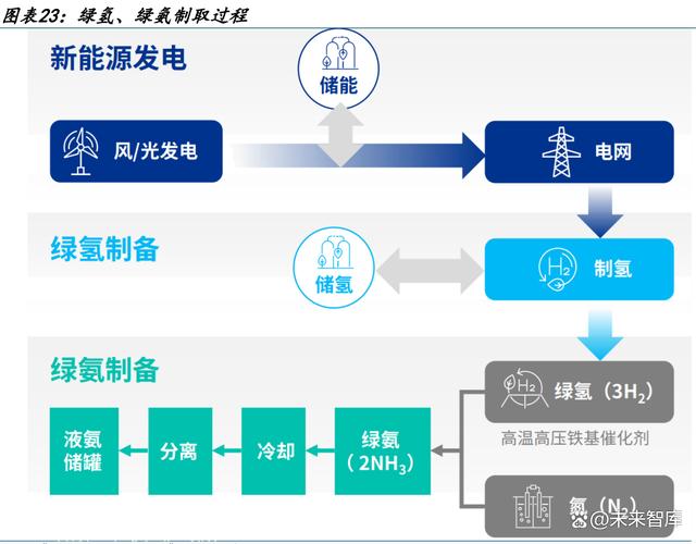 制氫環(huán)節(jié)是工業(yè)合成氨主要碳排放來(lái)源,電解水制氫可實(shí)現(xiàn)零碳排放。合成氨工業(yè)對(duì)氫 氣來(lái)源無(wú)特殊要求,可采用綠氫替代煤制氫與天然氣制氫,替代煤制氫后減碳超 2 億噸/ 年,實(shí)現(xiàn)除供熱環(huán)節(jié)外的零碳排放。傳統(tǒng)工業(yè)合成氨生產(chǎn)采用 Harber—Bosch 工藝,反 應(yīng)方程式為 3H2+N2→2NH3,其中的 N2來(lái)自空氣分離,工藝簡(jiǎn)單,氫氣來(lái)自煤制氫或天然氣 制氫,工藝較為復(fù)雜。煤制氫合成氨以及天然氣制氫合成氨都是“留氫去碳”,碳排放較 為嚴(yán)重,是合成氨工業(yè)主要的碳排放來(lái)源。 電解水制氫:反應(yīng)方程式為:2H2O→2H2+O2。根據(jù)電解水制氫方程式,生產(chǎn)氫氣不產(chǎn) 生碳排放。煤制氫:反應(yīng)方程式為:煤炭+02→CO+H2,CO+H2O→H2+CO2。煤制氫工廠平均每生產(chǎn) 1 噸氫氣碳排放約 25 噸,僅從原料消耗角度看,煤制氫路線的合成氨碳排放約為 4.2 噸/噸氨,依據(jù)我國(guó)約 6000 萬(wàn)噸/年的合成氨產(chǎn)量、70%為煤制氨計(jì)算,煤制氨碳排 放約 2 億噸/年。 天然氣制氫:反應(yīng)方程式為:CH4+02→CO2+2H2。根據(jù)天然氣制氫方程式,生產(chǎn) 1 噸氫 氣約排放二氧化碳 10 噸,僅從原料消耗角度看,天然氣制氫路線的合成氨碳排放約 為 2 噸/噸氨。