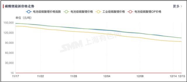 在11月內(nèi)兩度跌停并于11月29日跌破11萬(wàn)元后,12月4日,碳酸鋰期貨全部合約再度跌停,跌破10萬(wàn)元/噸;截止發(fā)稿前,電池級(jí)碳酸鋰現(xiàn)貨均價(jià)也跌至10.45萬(wàn)元/噸。