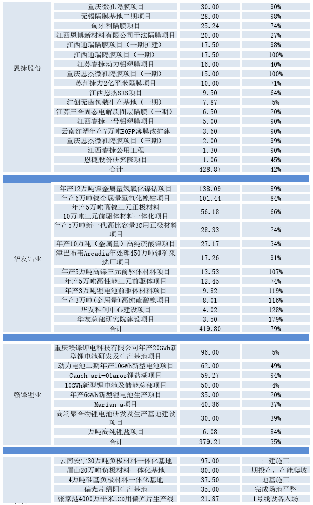 附表:電池產(chǎn)業(yè)相關(guān)企業(yè)重大在建、執(zhí)行項(xiàng)目投資預(yù)算TOP10企業(yè)