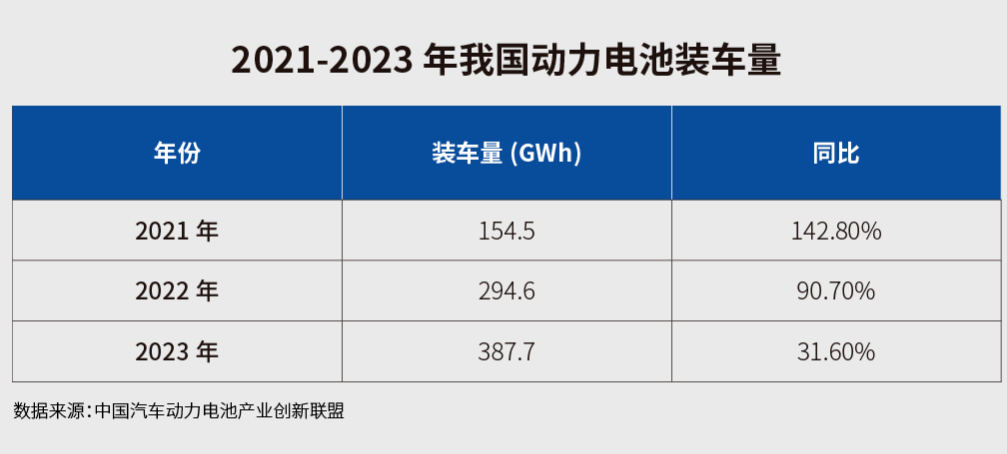 如果拉長時(shí)間來看,2021-2023年,我國動力電池裝車量依次為154.5GWh、294.6GWh、387.7GWh,逐年走高,不過,增速是在逐年放緩。