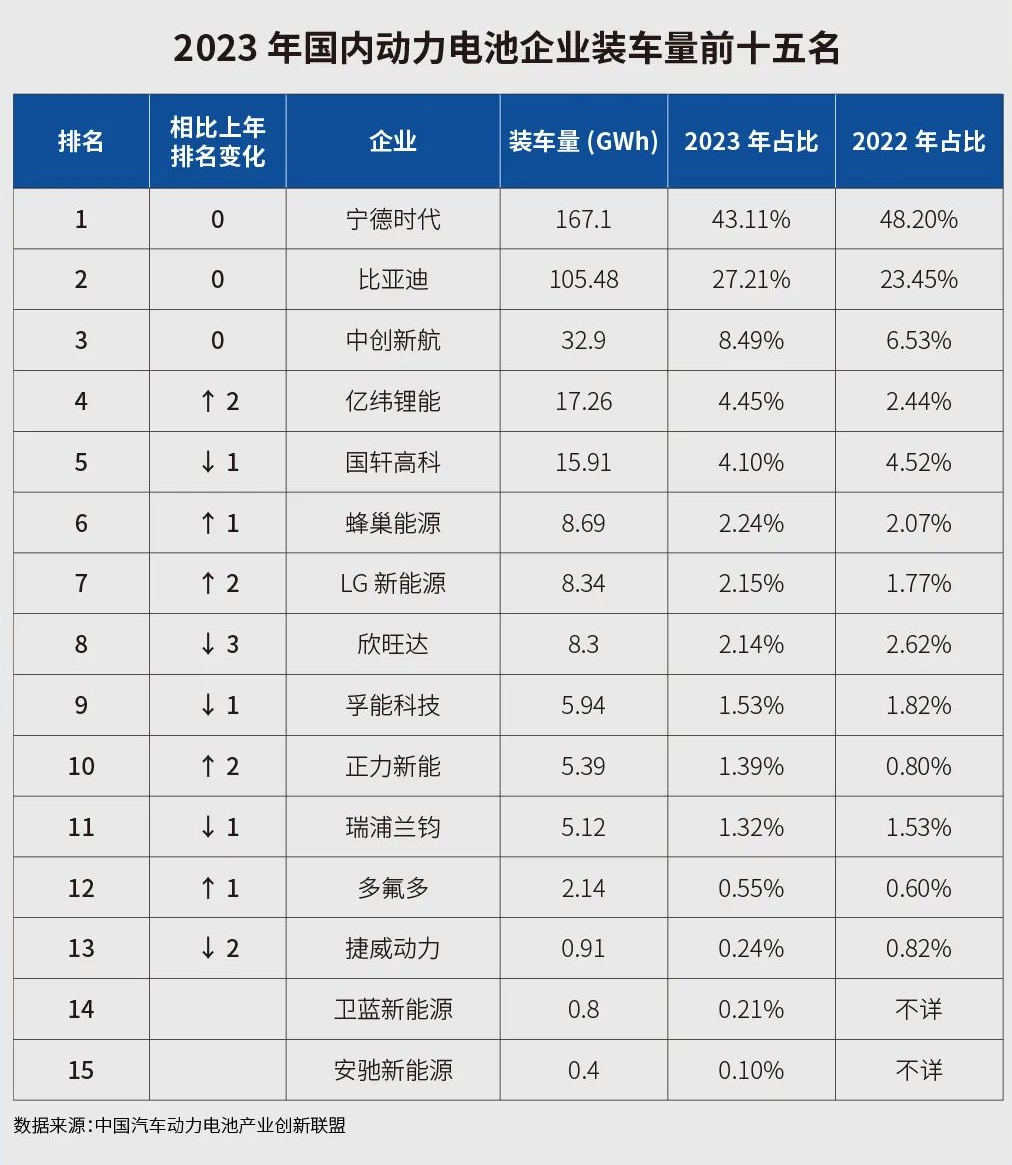 2023年,我國動力電池裝車量前15名依次是:寧德時(shí)代、比亞迪、中創(chuàng)新航、億緯鋰能、國軒高科、蜂巢能源、LG新能源、欣旺達(dá)、孚能科技、正力新能、瑞浦蘭鈞、多氟多、捷威動力、衛(wèi)藍(lán)新能源、安馳新能源。
