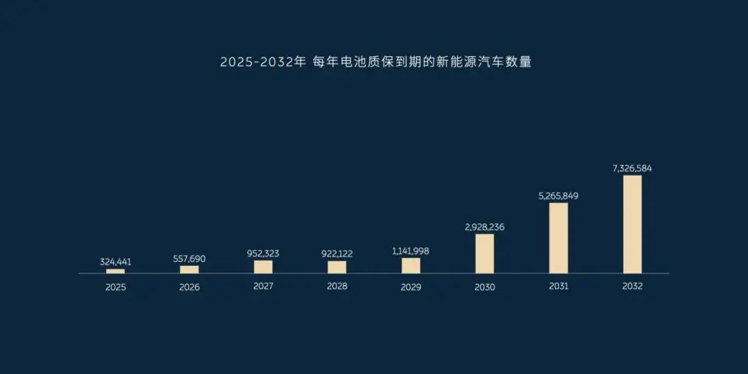 2025年,“脫保”電車將達到32萬輛,2028年達到98萬輛,而2032年將直接飆升至720萬輛。也即,未來的8年時間內(nèi),我國動力電池質(zhì)保到期的產(chǎn)品將累計突破千萬級,逼近2000萬輛。