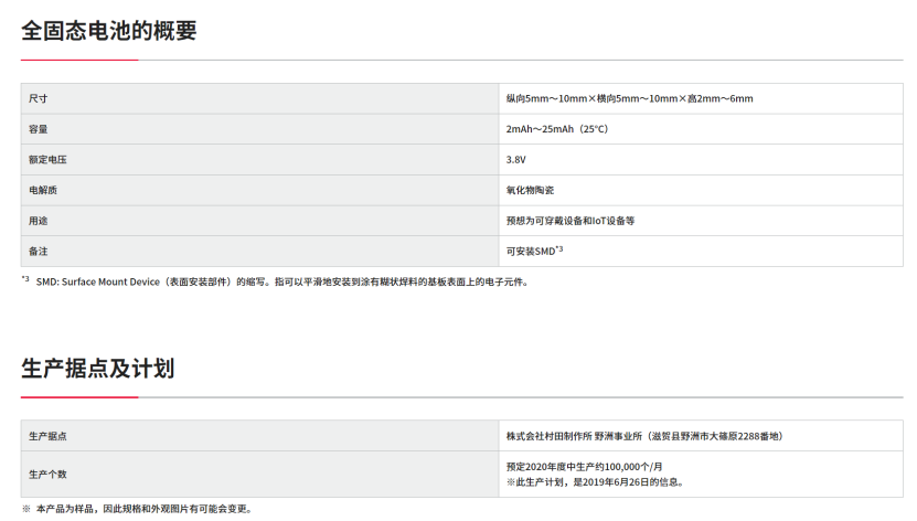 從2020年年中開始,村田在位于滋賀縣的工廠開始小型高容量全固態(tài)電池的生產(chǎn),規(guī)劃產(chǎn)量10萬個/約,規(guī)格2-25mAh,尺寸為長5-10mm,寬5-10mm,厚2-6mm,計劃將其用于助聽器、機器人等的位置控制設(shè)備以及在工廠中收集環(huán)境數(shù)據(jù)的IoT(物聯(lián)網(wǎng))設(shè)備等。