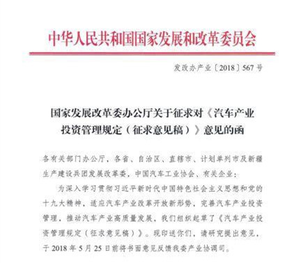 日前,國家發(fā)改委向有關(guān)部門印發(fā)了《汽車產(chǎn)業(yè)投資管理規(guī)定》(征求意見稿),目前征求意見階段已經(jīng)結(jié)束。據(jù)悉,此規(guī)定將于2018年正式出臺。