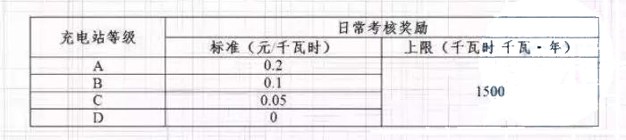 一是日常考核獎(jiǎng)勵(lì),即每三個(gè)月對(duì)公用充電站的平均充電收費(fèi)標(biāo)準(zhǔn)、利用率等經(jīng)營(yíng)情況進(jìn)行考核評(píng)價(jià),引導(dǎo)企業(yè)通過(guò)優(yōu)化收費(fèi)標(biāo)準(zhǔn)、創(chuàng)新運(yùn)營(yíng)模式等方式提質(zhì)增效。根據(jù)考核情況,對(duì)考核評(píng)價(jià)最好的A級(jí)充電站給予每度電0.2元的獎(jiǎng)勵(lì),獎(jiǎng)勵(lì)上限為1500度/千瓦·年。