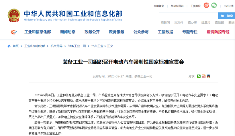 日前,工業(yè)和信息化部裝備工業(yè)一司、市場(chǎng)監(jiān)管總局標(biāo)準(zhǔn)技術(shù)管理司聯(lián)合組織召開(kāi)《電動(dòng)汽車安全要求》《電動(dòng)客車安全要求》和《電動(dòng)汽車用動(dòng)力蓄