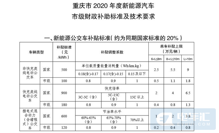 鼓勵全市新增和到期更新的公交車使用新能源汽車,繼續(xù)執(zhí)行新能源公交車購置補貼政策,按照此前重慶市發(fā)布的2020年新能源汽車補貼方案,今年僅對新能源公交車給予購置補貼,補貼標準約為同期國家補貼的20%。另外對購買(或融資租賃)并運營純電動(或燃料電池)公交車達到一定規(guī)模的市內運營企業(yè),市財政按一定比例給予獎勵。