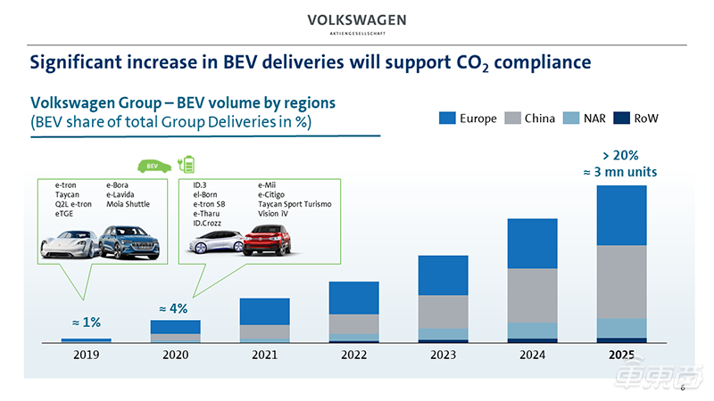 按照大眾的規(guī)劃,在這輪投資周期結(jié)束時,大眾集團2025年電動汽車的交付量將達到300萬輛,超過集團交付總量的1/5。