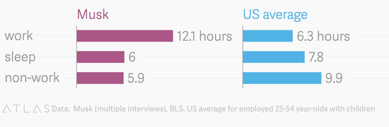 “當我睡得不夠時,我發(fā)現(xiàn)我會變得很暴躁 … 我也可以減少睡眠時間,但那樣我的思維敏捷程度就會受到影響。”根據(jù)美國勞工統(tǒng)計局的數(shù)字,美國25-54歲之間的普通人每天平均工作6.3小時,如果算上周末加班的話工作時間有12小時。也就是說馬斯克的睡眠與非工作時間都要比一般人少上20%-40%。(平時陪孩子時,馬斯克也會常常同時處理多封郵件。)