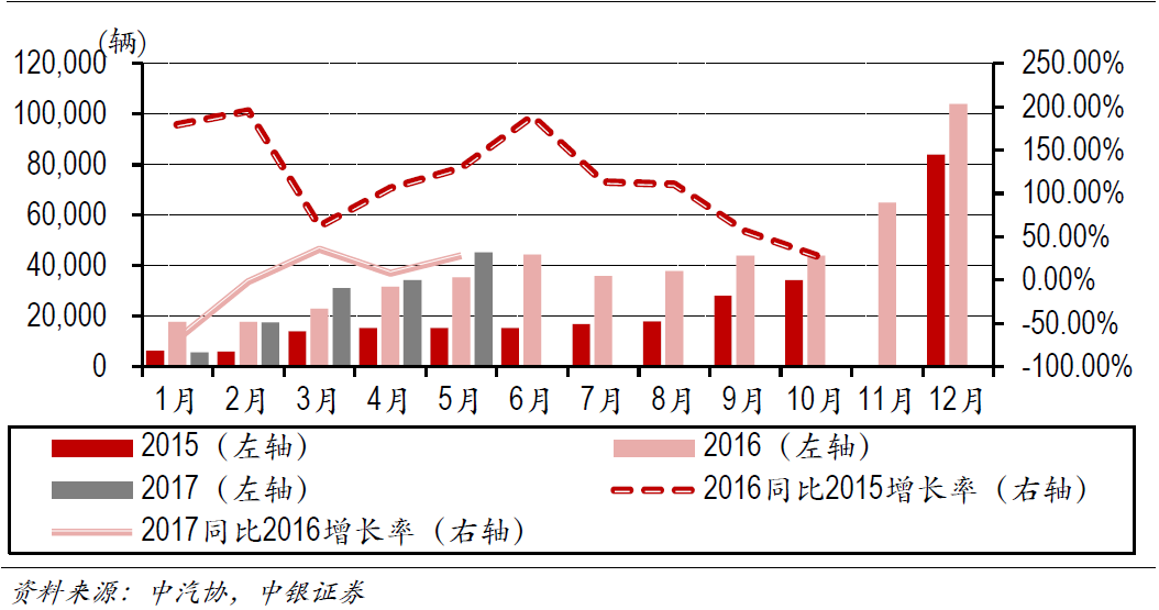 新能源汽車市場在培育期受外部因素影響顯著。2017 年6 月新能源汽車產(chǎn)銷量分別為6.5萬輛和5.9萬輛 ,同比增長分別為43.4%和33%。但2016年10月份之后,新能源汽車產(chǎn)銷量進(jìn)入低谷,2016年11月和2017年的1-2月份均呈負(fù)增長。