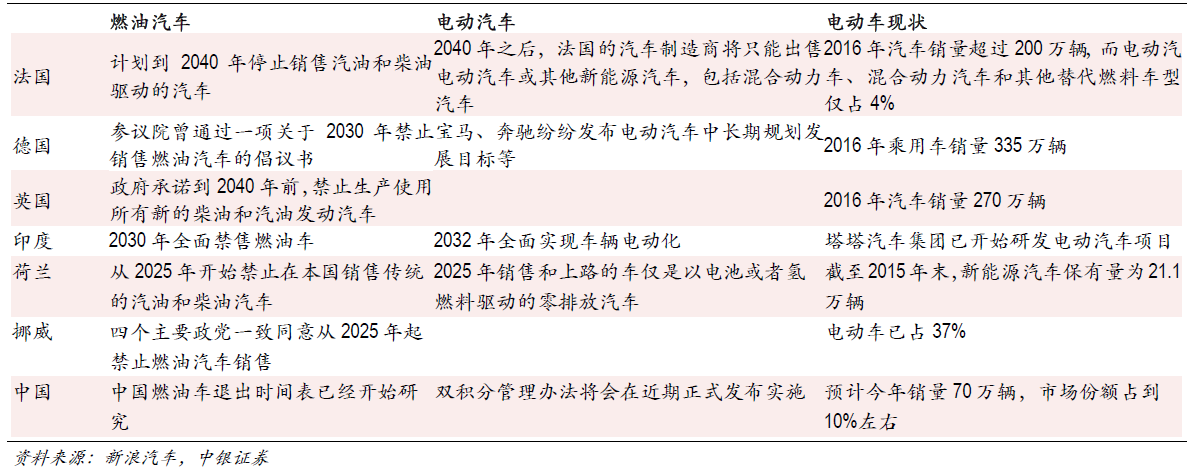 今日電池雜志-電池聯(lián)盟訊(左右 北京報道)中銀國際證券有限責(zé)任公司9月14日發(fā)布了一份研究報告,報告指出:中國在雙積分政策的誘導(dǎo)下,新能源車將會出現(xiàn)爆發(fā)增長,預(yù)示著全球化市場背景下,燃油車已經(jīng)開始啟動退出“倒計時”;中國電動汽車產(chǎn)業(yè)由培育期進(jìn)入成長期;從全球來看,傳統(tǒng)汽車廠家紛紛布局新能源汽車。