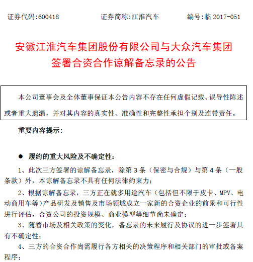 大眾汽車股份公司、大眾汽車(中國)投資有限公司和安徽江淮汽車集團(tuán)股份有限公司,各方有意利用各自在多用途汽車領(lǐng)域的技術(shù)和商務(wù)優(yōu)勢(shì),在符合法律法規(guī)和國家政策的框架下,面向中國及海外市場,深入探討合作模式,以期實(shí)現(xiàn)各方共同合作開發(fā)銷售多用途車等目標(biāo)。