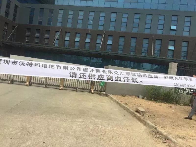 2018年3月25日,在深圳市坪山新區(qū)的沃特瑪總部大門(mén)前,有供應(yīng)商拉出“深圳市沃特瑪電池有限公司虛開(kāi)商業(yè)承兌匯票欺騙供應(yīng)商,到期無(wú)法承兌,請(qǐng)還供應(yīng)商血汗錢(qián)”的白色橫幅向沃特瑪追討資金。
