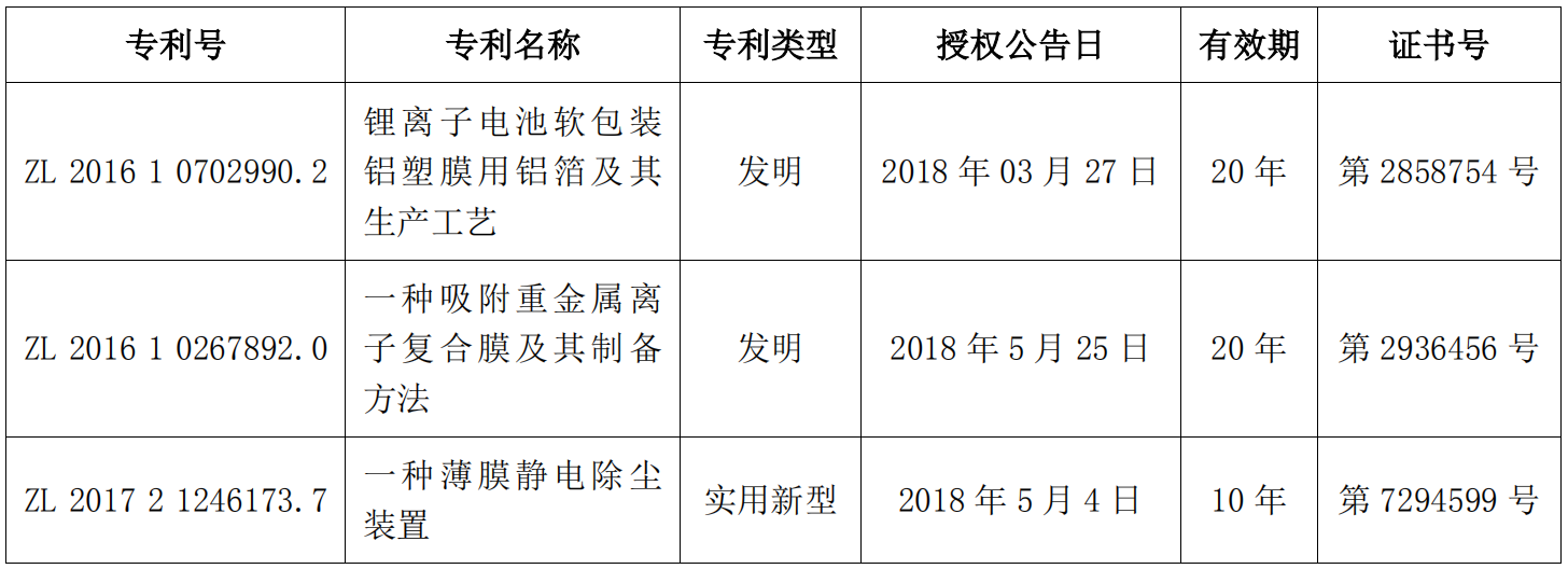 電池軟包裝鋁塑膜產(chǎn)品上,其熱封強(qiáng)度、漲破強(qiáng)度、層間強(qiáng)度、電解液耐受性、冷沖深完全滿足鋰離子電池使用性能要求,系公司開發(fā)的鋁箔新產(chǎn)品,目前已完成技術(shù)驗(yàn)證,開始供應(yīng)日本、歐洲客戶使用。發(fā)明專利“一種吸附重金屬離子復(fù)合膜及其制備方法”是一種石墨烯涂布高分子膜的工藝,用于高效治理水體重金屬離子,作為公司未來的技術(shù)儲備。實(shí)用新型專利“一種薄膜靜電除塵裝置”已應(yīng)用于紙包裝材料產(chǎn)品的生產(chǎn)工藝中。