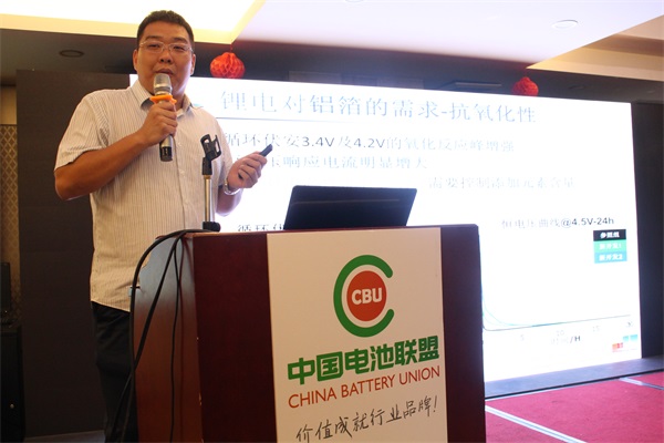 ATL主任工程師王可飛講到,雖然我們主要做3C類電池,但也有涉及動(dòng)力電池領(lǐng)域的想法,今天分享一些我們電池企業(yè)對(duì)鋁制品提出具體質(zhì)量性能需求的原因。從電壓穩(wěn)定性、電導(dǎo)率、價(jià)位等因素綜合對(duì)比,目前選鋁箔做正極集流體最合適,繼而,我們鋰電對(duì)鋁箔的需求是抗氧化性、拉伸強(qiáng)度、延伸率、表面張力、重量一致性、版型、切邊質(zhì)量、少針孔,就抗氧化,循環(huán)伏安、恒電壓曲線反應(yīng),抗氧化性可能對(duì)電芯性能有影響,需要控制添加元素含量……
