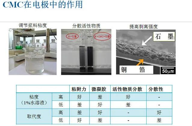 具體到電池中,CMC的作用有:對負(fù)極活性材料及導(dǎo)電劑起到分散作用;對負(fù)極漿料起到增稠及防沉降作用;輔助粘結(jié)作用;穩(wěn)定電極的加工性能,輔助改善電池循環(huán)性能;提高極片的剝離強(qiáng)度等。