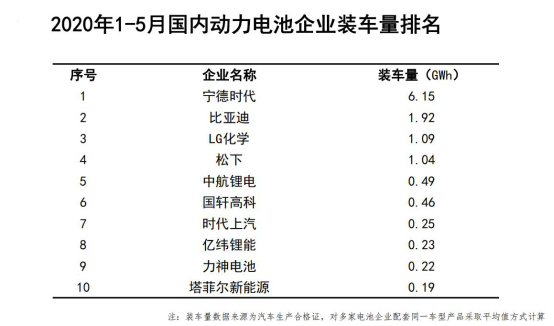 2020年5月,我國(guó)新能源汽車市場(chǎng),實(shí)現(xiàn)裝車配套排名前十的動(dòng)力電池企業(yè)分別為,寧德時(shí)代、比亞迪、LG化學(xué)、松下、中航鋰電、國(guó)軒高科、時(shí)代上汽、力神電池、塔菲爾新能源、億緯鋰能。