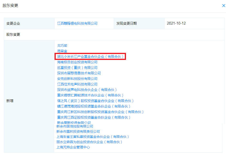企查查顯示,贛鋒鋰電近日新增多位股東,其中包括湖北小米長(zhǎng)江產(chǎn)業(yè)基金合伙企業(yè)(有限合伙)(以下簡(jiǎn)稱“小米產(chǎn)投”)。