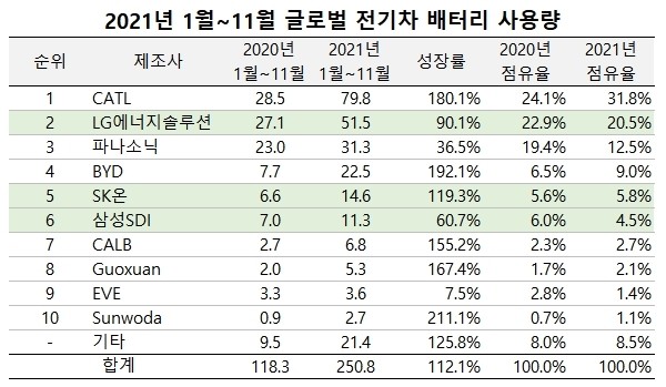 SNE Research指出,今年1-11月,中國企業(yè)引領(lǐng)了全球電動汽車市場(包含純電、插電混動和混合動力汽車)的增長。僅寧德時代和比亞迪兩家,市場占有率就超過40%,且與去年同期相比增長了180%、192%,在電動汽車市場有著極高的地位。據(jù)該機(jī)構(gòu)分析,2021全年排名將和前11個月保持一致。