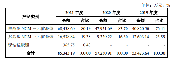 從帕瓦股份招股書來(lái)看,2019-2021年,其單晶型NCM三元前驅(qū)體的收入占比均在80%左右。報(bào)告期內(nèi),隨著客戶需求逐步增加、產(chǎn)能提升和自身業(yè)務(wù)結(jié)構(gòu)的調(diào)整,公司單晶型NCM三元前驅(qū)體的銷售收入逐年上升,多晶型NCM三元前驅(qū)體的銷售收入總體上升。