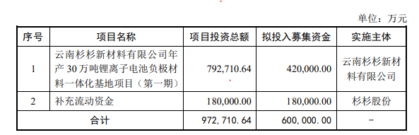 電池負(fù)極材料一體化基地項(xiàng)目(第一期)、18億元用于補(bǔ)充流動(dòng)資金。