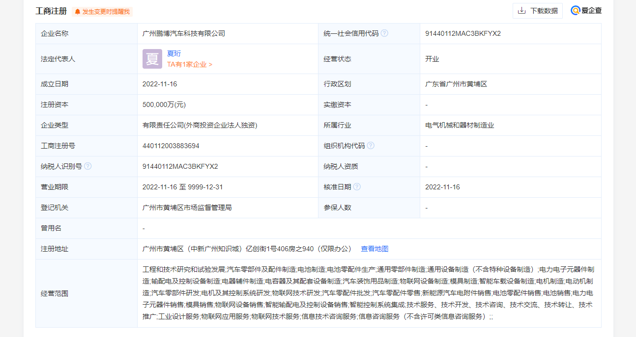 天眼查顯示,廣州鵬博汽車科技有限公司(以下簡稱鵬博汽車科技)于近日成立,法定代表人夏珩,注冊資本50億元。經(jīng)營范圍包括