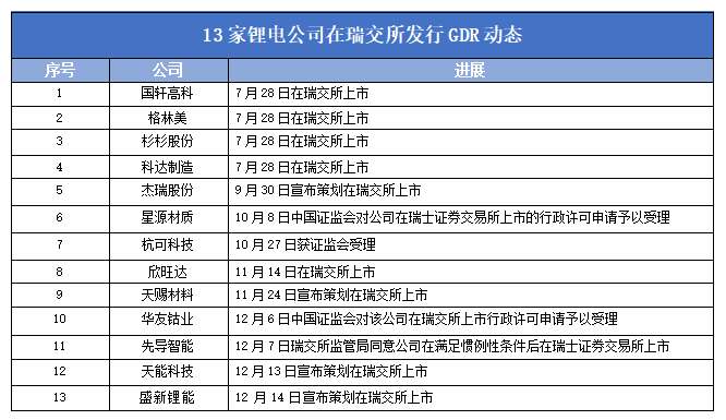 值得注意的是,除了天能股份和盛新鋰能之外,為加速全球化布局,已有多家國內鋰電企業(yè)正式或擬發(fā)行GDR,并登陸瑞士證券交易所。