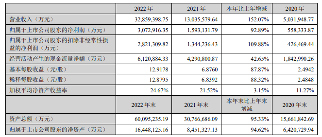 3月9日晚,寧德時代披露2022年年度報告。年報顯示,去年寧德時代營收突破3000億元,共實現(xiàn)營業(yè)收入3285.94億元,同比增長152.07%;歸母凈利則首次突破300億元,大增92.9%,達到307.29億元。